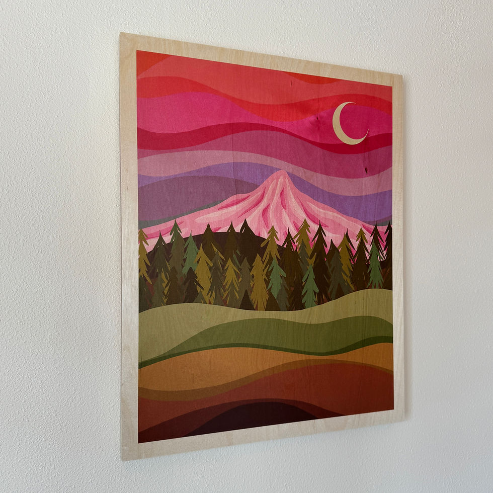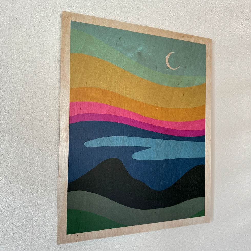 I created this collection of designs between scenic road trips, camping by the lake and adventures using my digital sketchbook. Each print is hand printed on Maple Wood, and hangs up on the wall without framing!